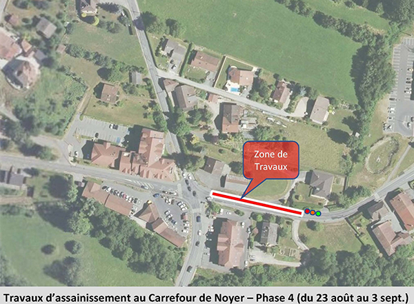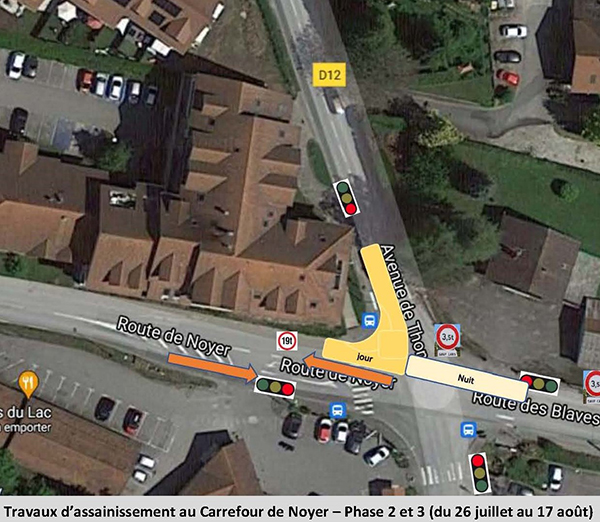 L’accès aux propriétés riveraines ainsi qu’aux commerces (boulangerie, presse, coiffeur, pôle médical…) sera maintenu en permanence. Pendant cette première phase, la circulation est maintenue normalement sur l’ensemble des autres voies attenantes au carrefour. - Phase Carrefour de Noyer, du 26 au 30 juillet