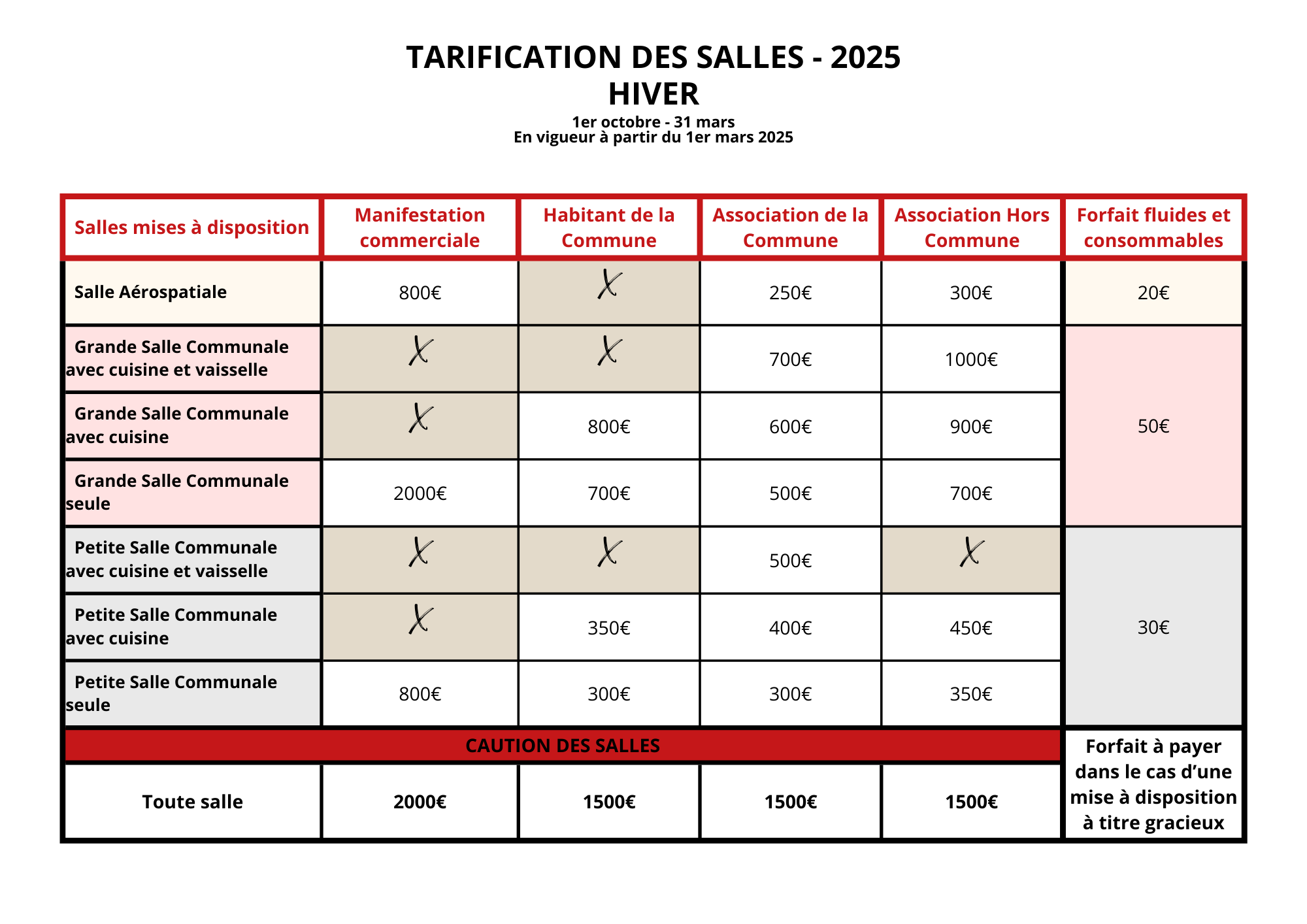 NB : À compter du 1er janvier 2019, les salles ne seront plus louées aux personnes extérieures à la commune (hors associations).